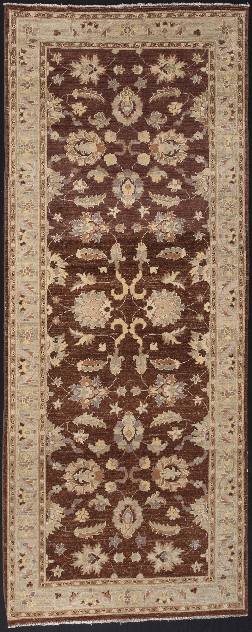 Handgefertigter Ziegler-Teppich, Wolle, aus dem Land Pakistan, in einem sich wiederholenden abstrakten Muster mit Blumen, braun-korallefarbenem Hintergrund und beiger Bordüre. Mittlere Dicke mit hoher Knotendichte.